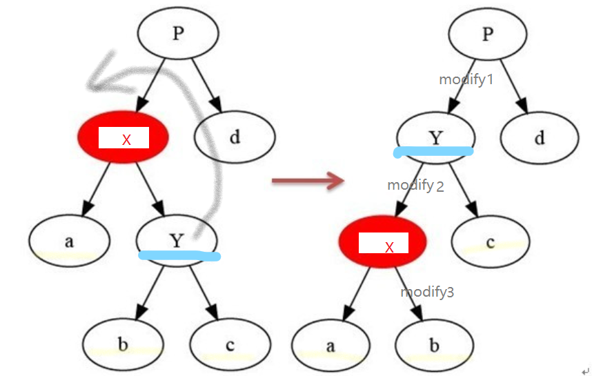 在某个结点x上做左旋操作:以x到y(x的右孩子)之间的链为“支轴”进行,它使y成为该孩子树新的根,y的左孩子b成为x的右孩子