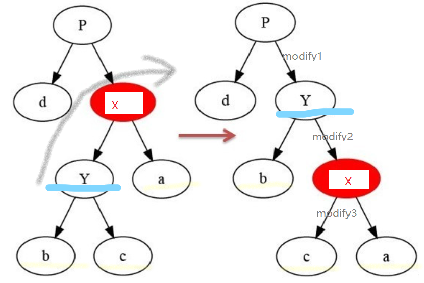 在某个结点x上做右旋操作:以x到y(x的左孩子)之间的链为“支轴”进行,它使y成为该孩子树新的根,y的右孩子c成为x的左孩子