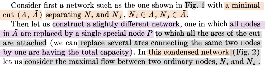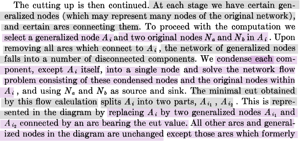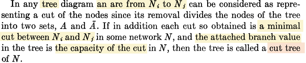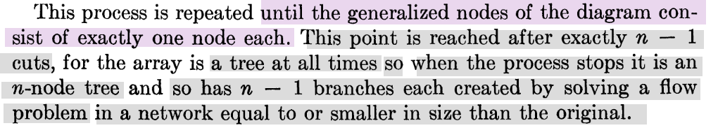这个性质应用到最终划分所得树上,以及根据划分过程,得到最终树的性质:关键是这个性质使得可以n-1代替n(n-1)/2、进行合并:最终树的边既是cut又是maxflow,cut则两点间maxflow<=min(树上路径),maxflow则两点间maxflow>=min(树上路径),因此两点间maxflow==min(树上路径)