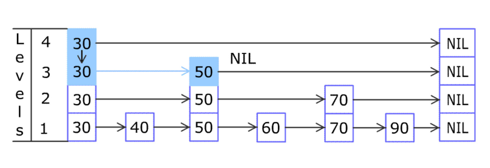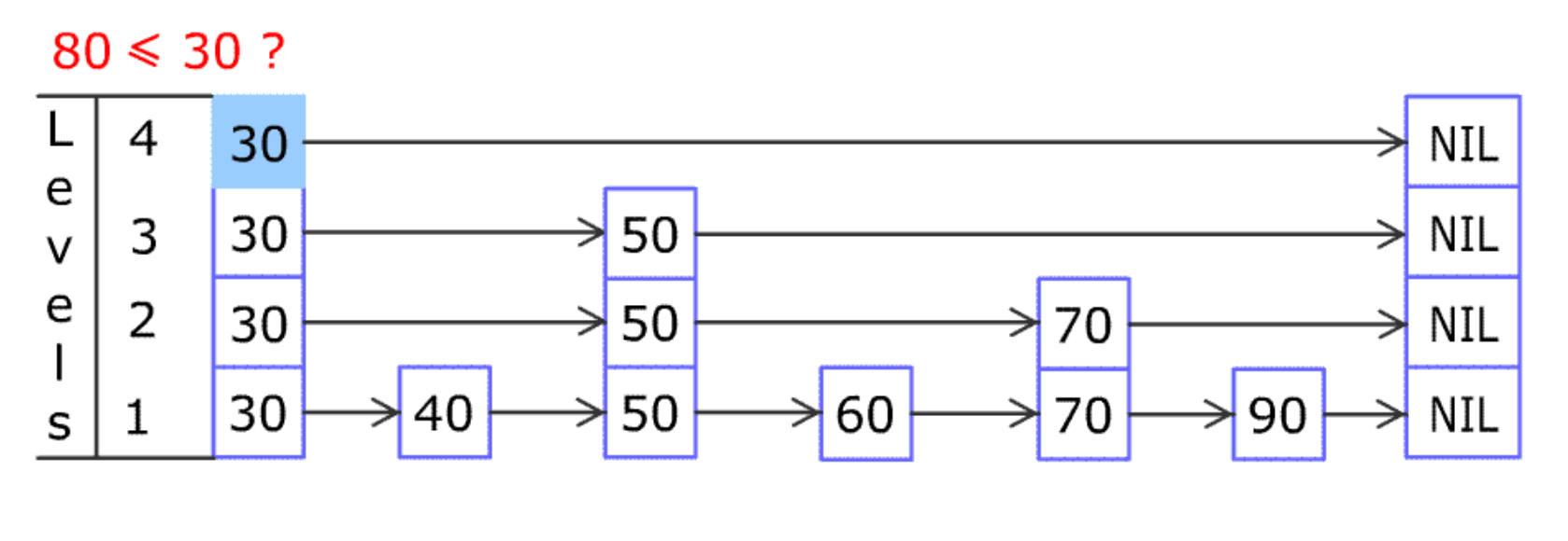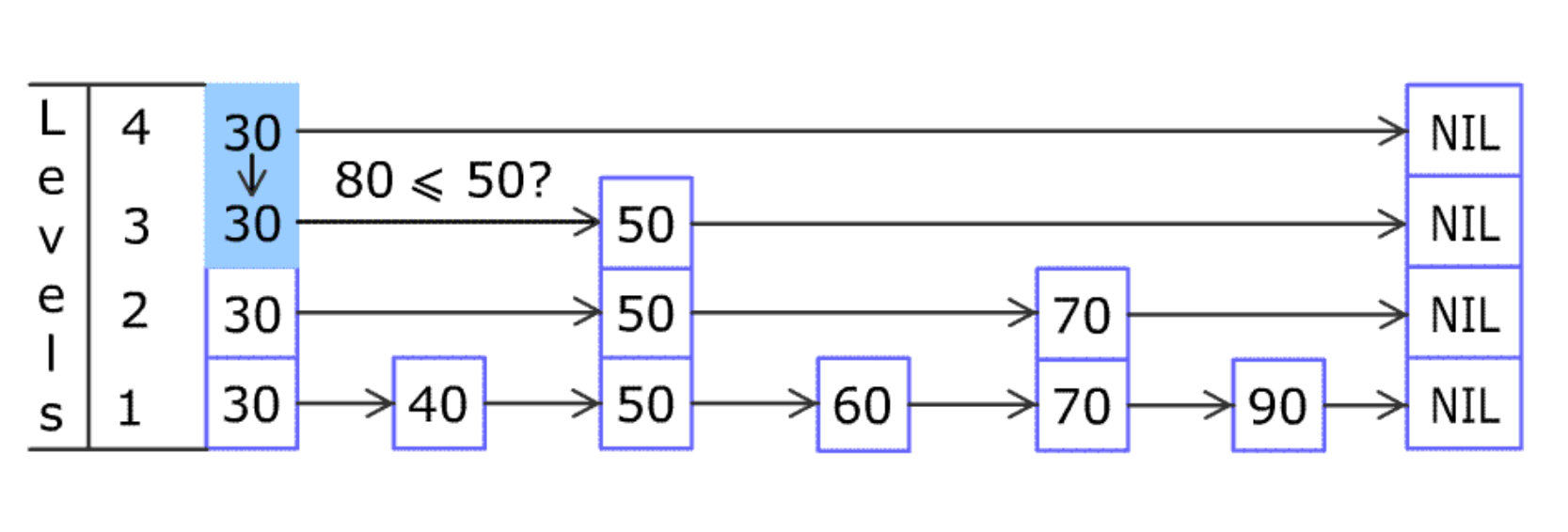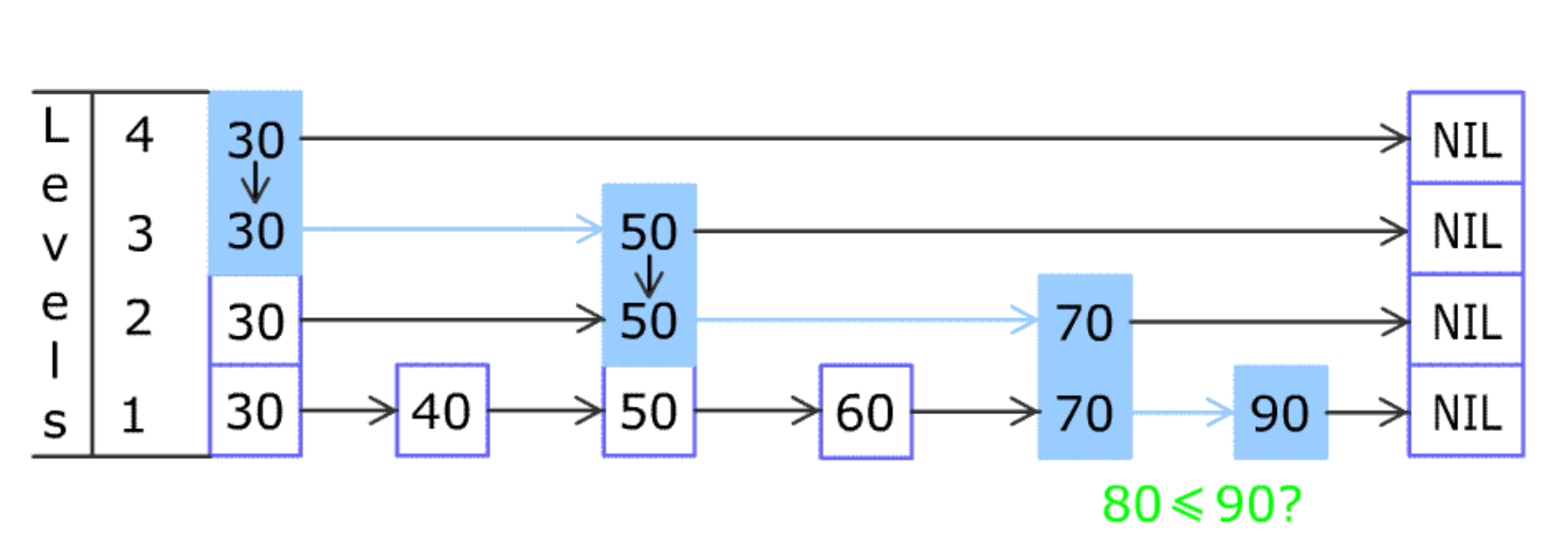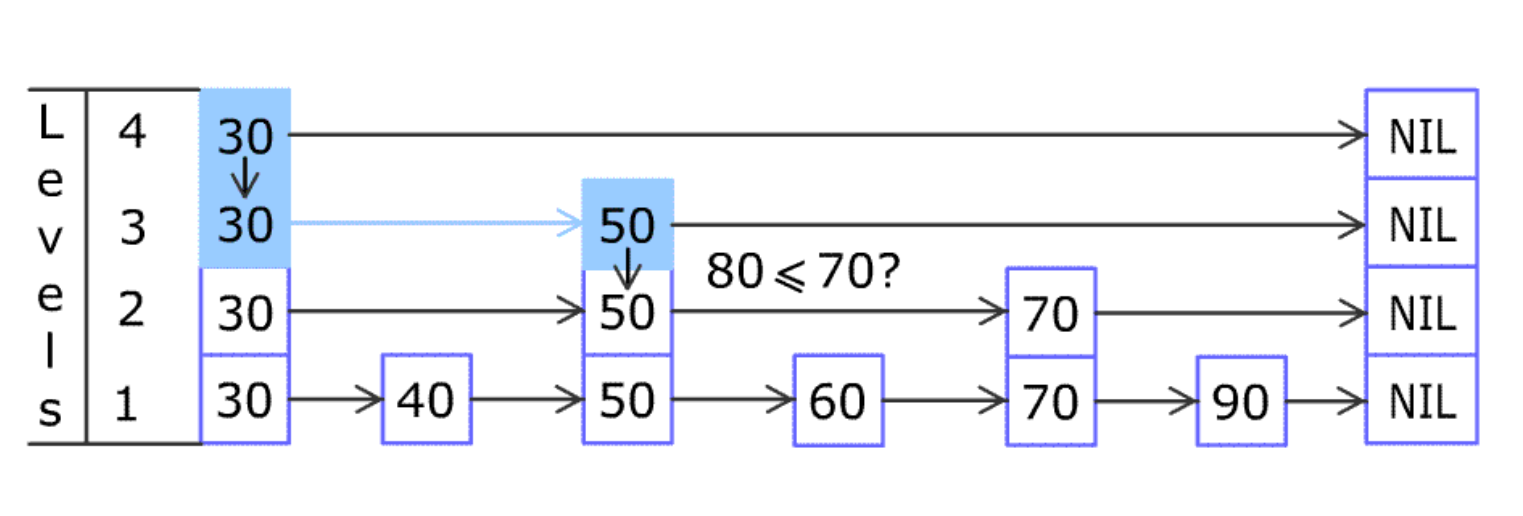 算法沿着每层链表搜索,直至找到一个大于或等于目标的元素,或者到达当前层列表末尾。