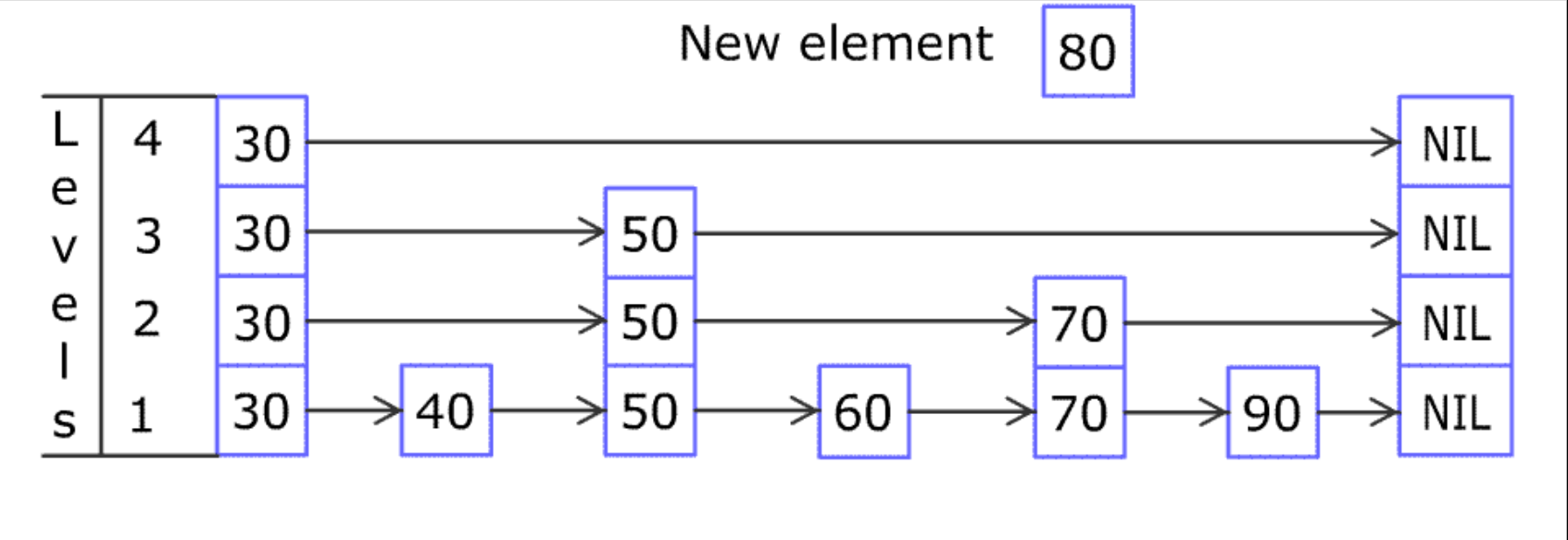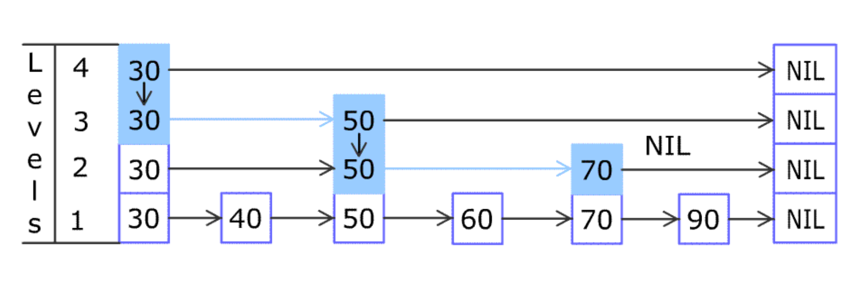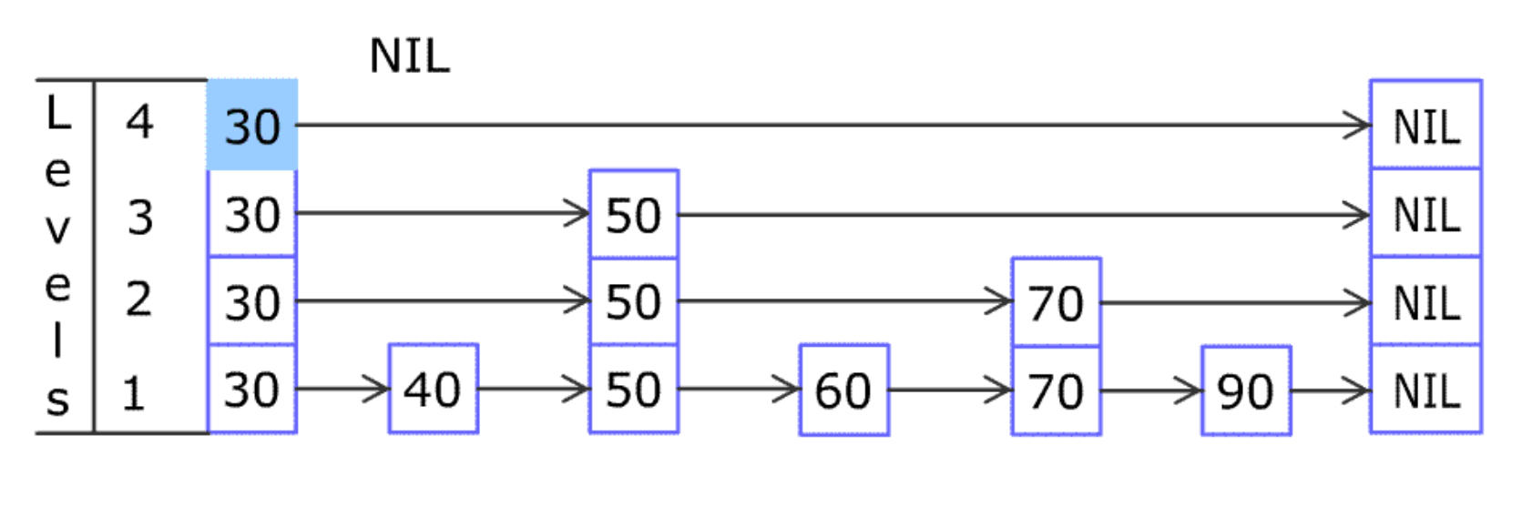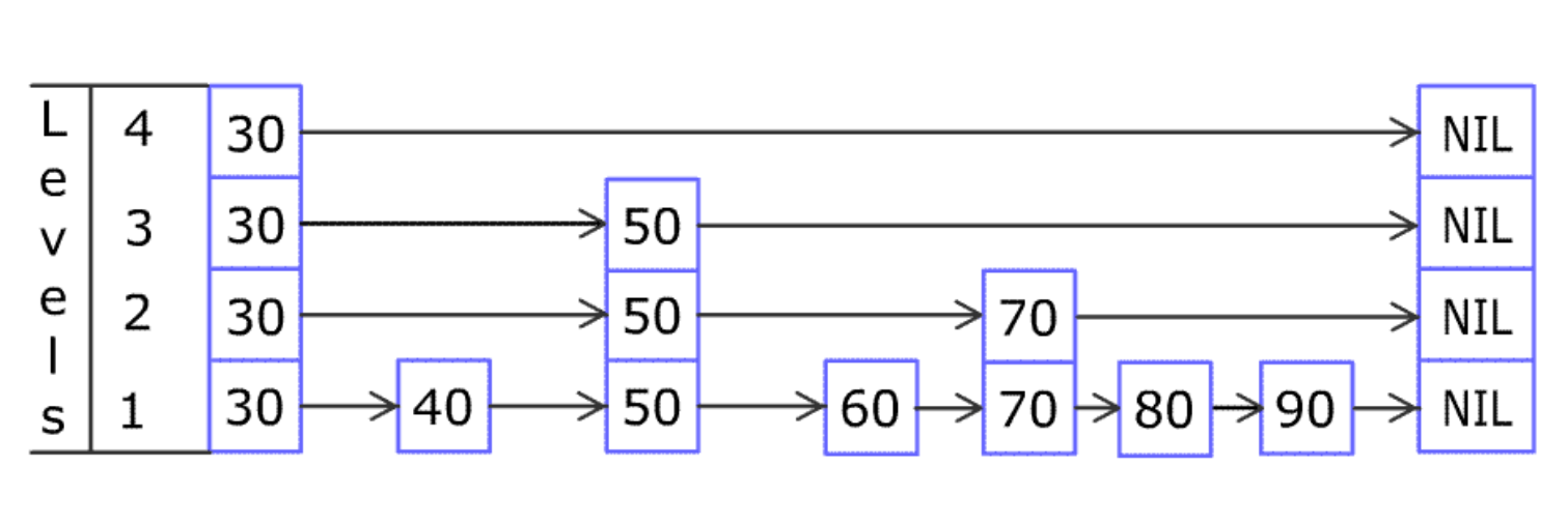复杂度 - 一个多层次的链表。与前一层(下面一层)链表元素的数量相比,每一层链表中的元素的数量更少。每一层是有序的