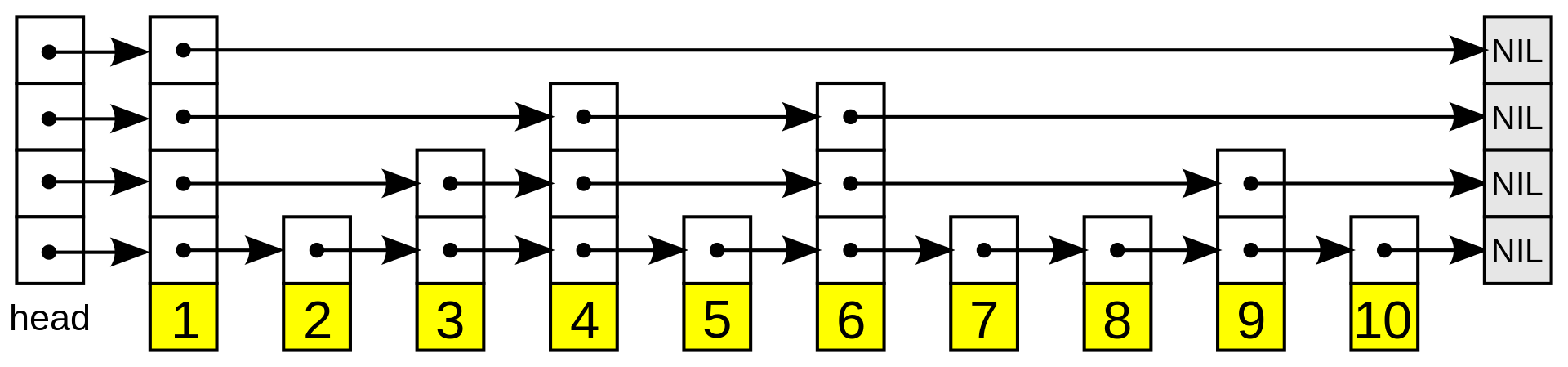 复杂度 - 一个多层次的链表。与前一层(下面一层)链表元素的数量相比,每一层链表中的元素的数量更少。每一层是有序的