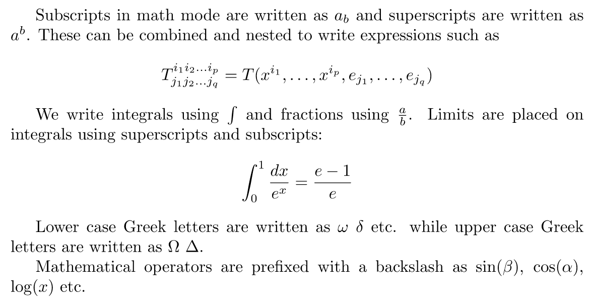 Subscripts(下标) in math mode are written as $a_b$ and superscripts(上标) are written as $a^b$. These can be combined and nested to write expressions such as