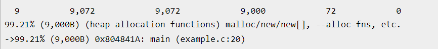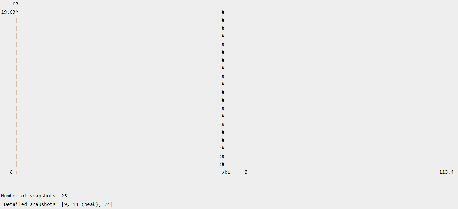 - Some snapshots are detailed. Information about where allocations happened are recorded for these snapshots, as we will see shortly. Detailed snapshots are represented in the graph by bars consisting of ‘@’ characters. The text at the bottom show that 3 detailed snapshots were taken for this program (snapshots 9, 14 and 24). By default, every 10th snapshot is detailed, although this can be changed via the –detailed-freq option.