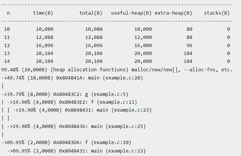 下面最后部分的含义:n=14的snapshots的主要堆内存占用from three different code locations: line 20, which is responsible for 10,000B (49.74%); line 5, which is responsible for 8,000B (39.79%); and line 10, which is responsible for 2,000B (9.95%).