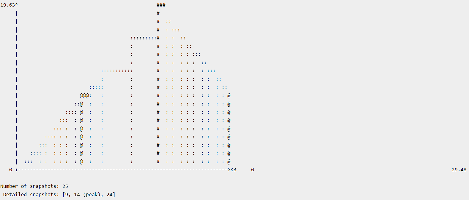 - Some snapshots are detailed. Information about where allocations happened are recorded for these snapshots, as we will see shortly. Detailed snapshots are represented in the graph by bars consisting of ‘@’ characters. The text at the bottom show that 3 detailed snapshots were taken for this program (snapshots 9, 14 and 24). By default, every 10th snapshot is detailed, although this can be changed via the –detailed-freq option.