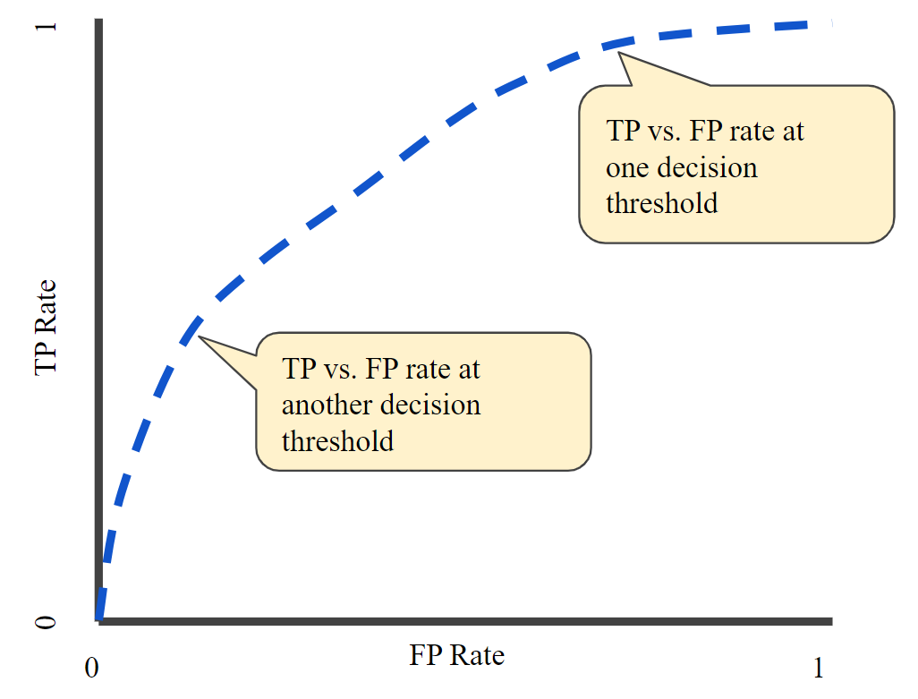 An ROC curve plots TPR vs. FPR at different classification thresholds. 给不同的thresholds,会影响一个样本是分到positive类还是negative类